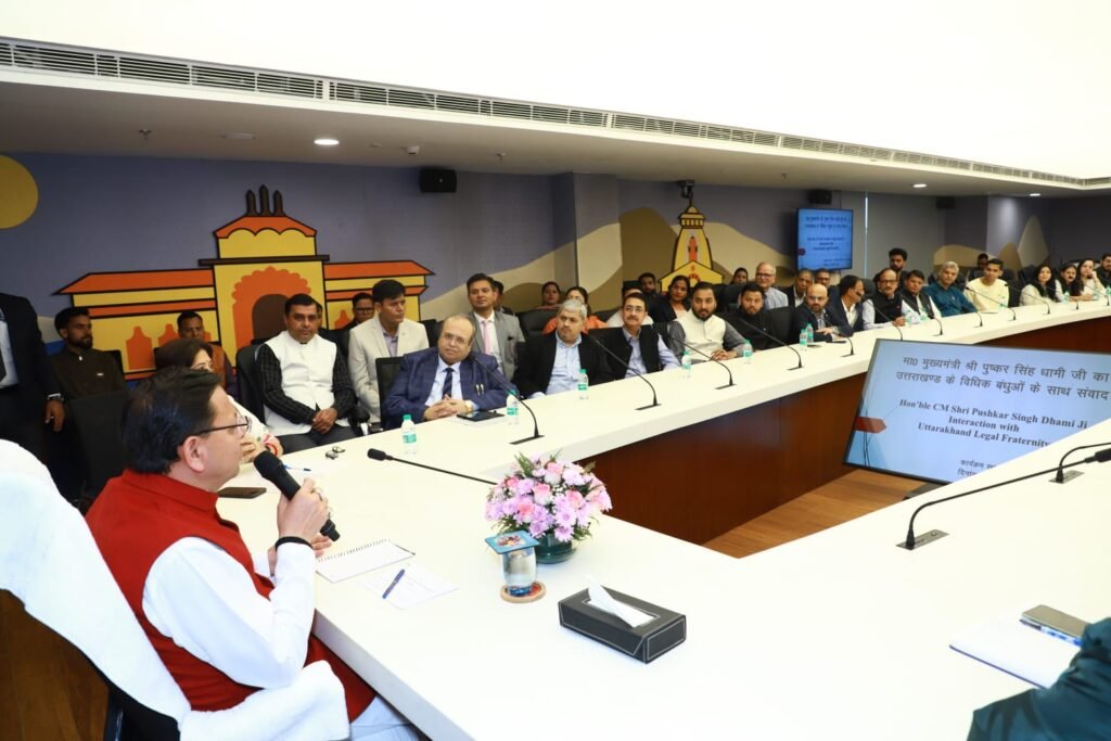 नई दिल्ली स्थित उत्तराखण्ड निवास में उत्तराखण्ड राज्य की रजत जयंती वर्ष के अवसर पर मुख्यमंत्री पुष्कर सिंह धामी ने प्रवासी उत्तराखण्डी अधिवक्ताओं के साथ संवाद किया। इस दौरान उन्होंने राज्य के विकास हेतु अधिवक्ताओं के साथ गहन विचार-मंथन किया। इस दौरान उन्होंने कानून व्यवस्था को सुदृढ़, पारदर्शी और प्रभावी बनाने के लिए सरकार द्वारा किए जा रहे प्रयासों और नीतिगत पहलों की जानकारी साझा की।